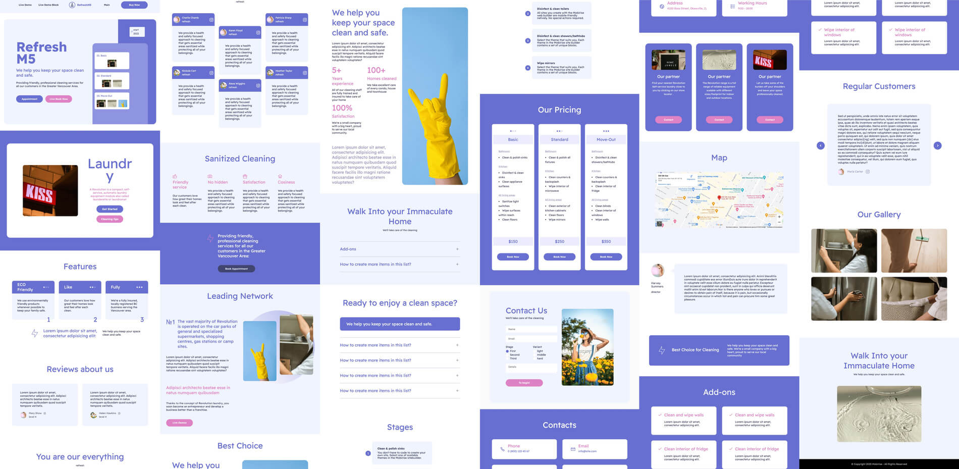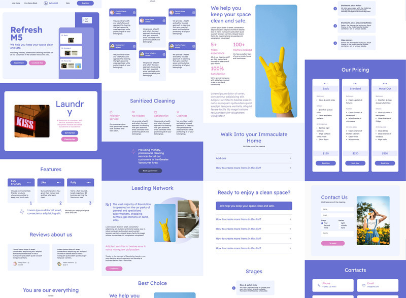 RefreshM5 comes with a set of Bootstrap 5 blocks for cleaning service companies, dishwasher, car washing, disinfectant, Cleaning supply, washing services, heavy equipments, Pest Control Equipment, Cleaners Business, sanitizing, laundryman, dry cleaning, clothes cleaning, house help, window Cleaning, dry cleaning shops, corporate cleaning solutions, maid service companies, free clean, pool services and general service company. It will undoubtedly capture your clients' eye due to the round corners and vibrant colors.
