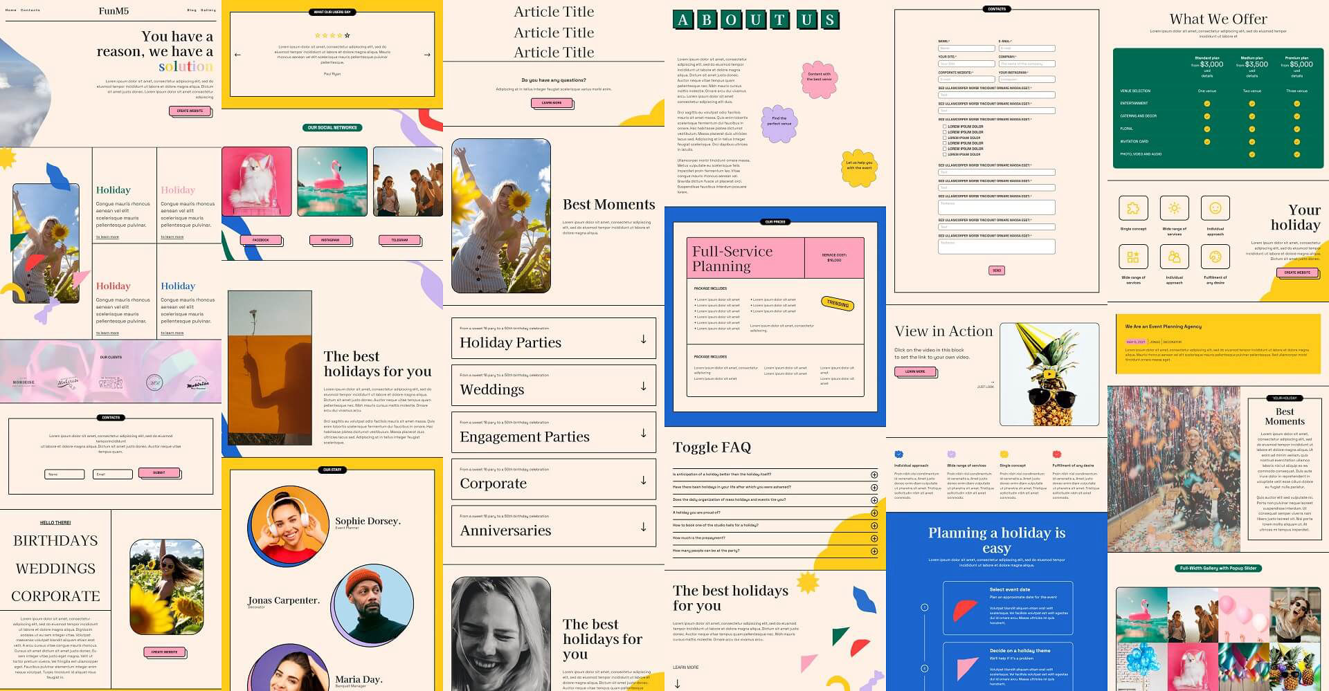 FunM5 is a colorful Bootstrap theme. It is an ideal theme for event planners whether, parties, anniversaries, house warming, weddings, event coordinator, event manager, event facilitator, stage decorator, baby shower planner, event analyst, marriage, celebration, event managers, birthdays, business meetings, happenings, engagement, conference, grand events, contest, tournament. If you want to create a cool website, this theme will provide you with colorful backgrounds, borders, link and button animations, galleries, articles and more.